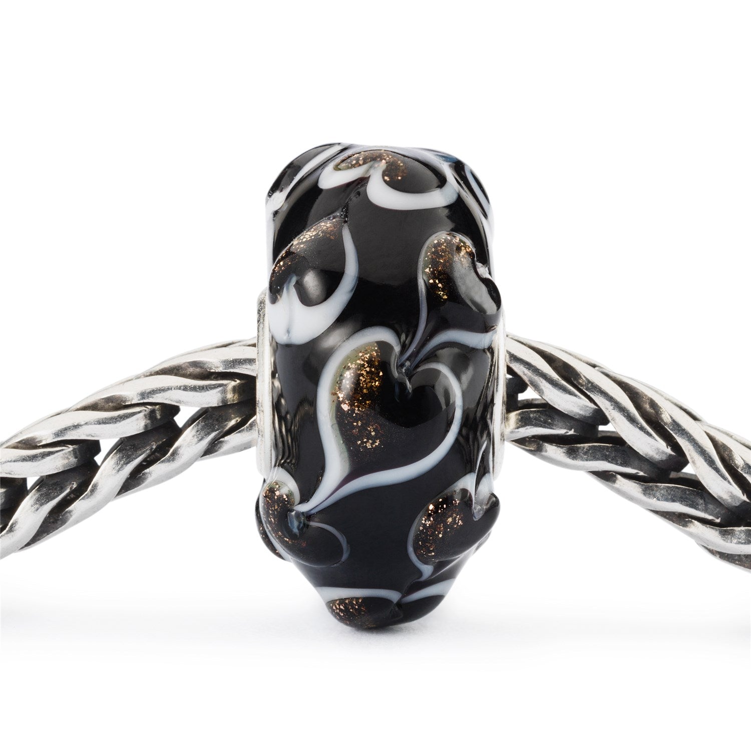 The elegant black glass bead is adorned with black hearts framed in classy white. Inside each heart are flecks of golden glitter.