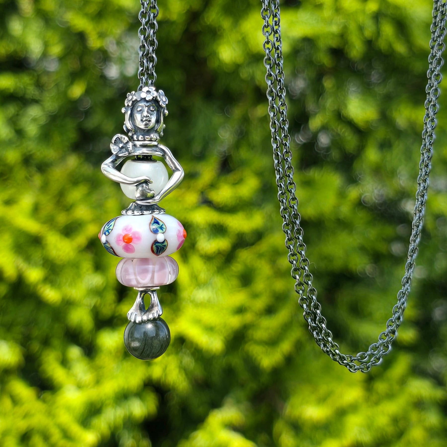 This charming combination features a statement Jumbo Unique Bead, a subtle Pastel Shadow Bead, and a smooth Round White Moonstone Bead.