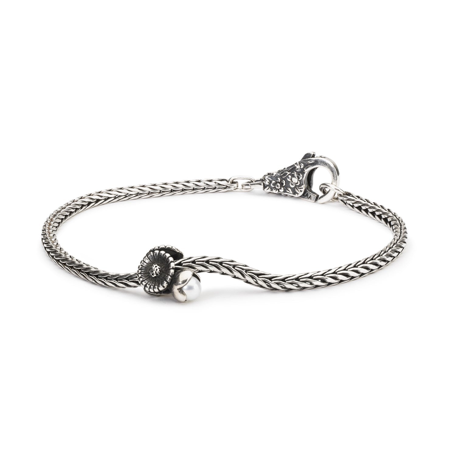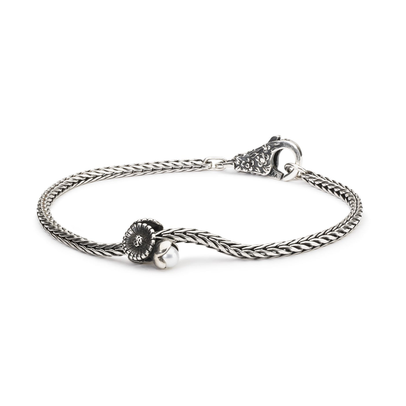 A Sterlings silver bracelet decorated with the sweet birth flower of April. A Daisy in silver concealing a white freshwater pearl. The bracelet is finished with a decorative Lace Clasp. A brilliant and exclusive gift for April birthdays and occasions.