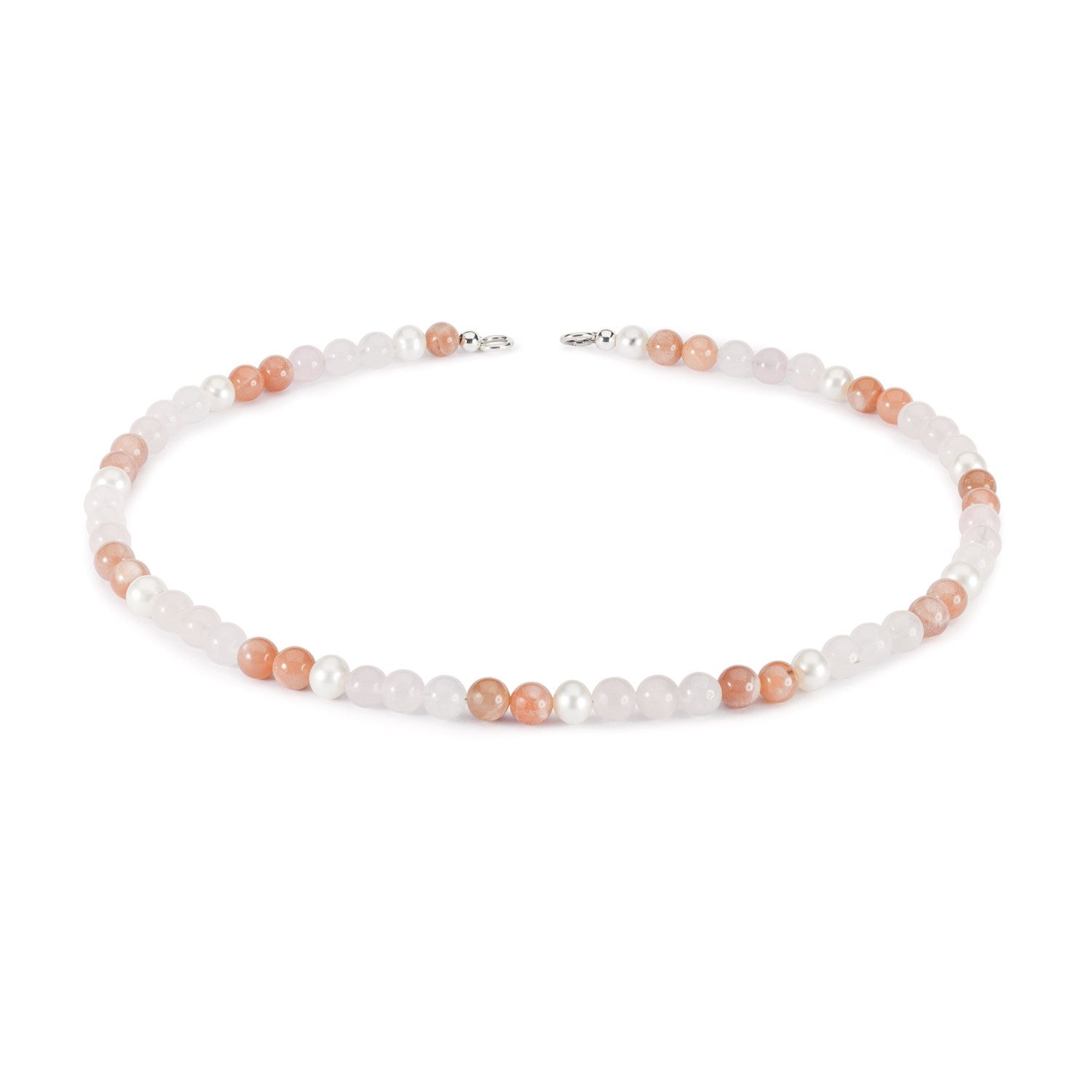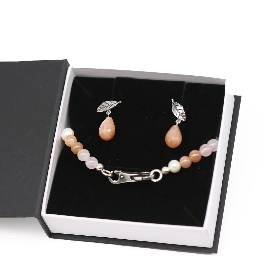 The set includes the Dream of Love Necklace with a Plain Clasp accompanied by the Leaves of Protection Studs. This gentle Love Necklace is a handcrafted gemstone necklace with Rose Quartz, Feldspar Moonstone and Freshwater Pearls. The earrings made out of Sterling Silver and faceted Feldspar Moonstone give an asymmetrical look completing this set and making it one of a kind.