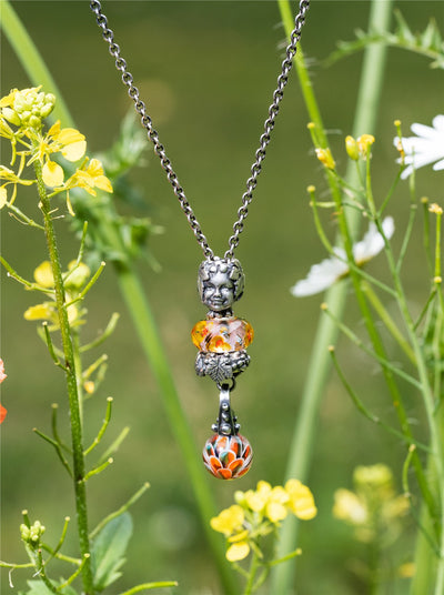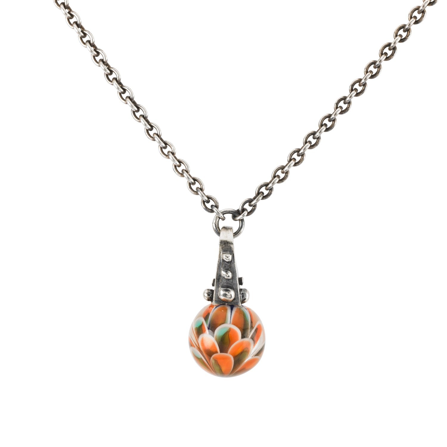 A round glass bead with leaves in orange, green and blue. The pendant is of silver with bark texture and dew drops.