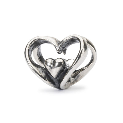 Bead entirely made of silver with two interlocking hearts design that have smaller hearts inside. Symbolizing love and connection.