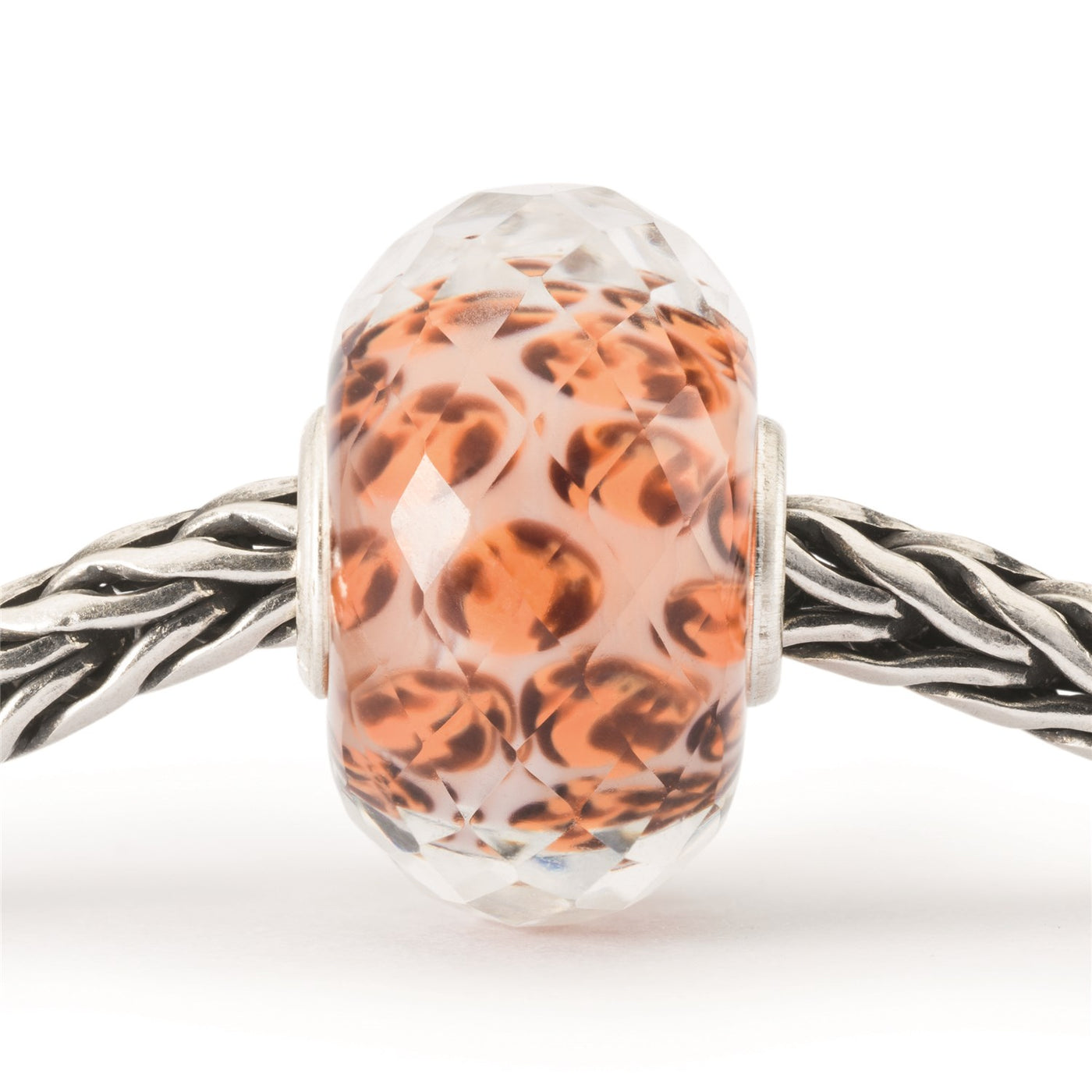 A beautiful faceted glass bead with a leopard spot pattern resembling that of a leopard. The spots are a mix of orange, and light brown tones on a beige background.