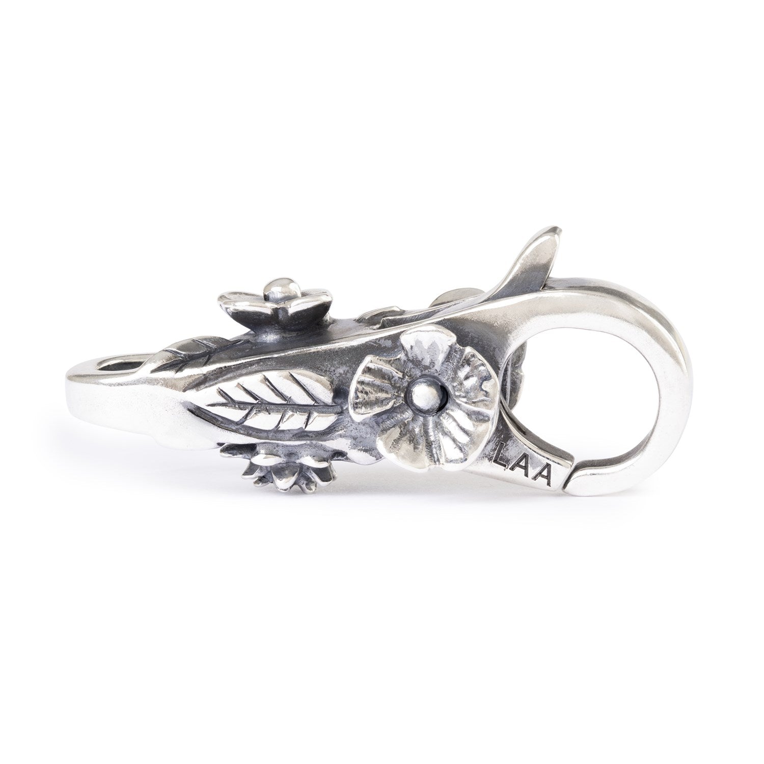 A detailed clasp decorated with blooming flowers and leaves. The design symbolises connection and growth, bringing each story together in one gentle flow.