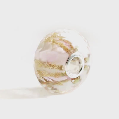 A lovely faceted glass bead with a soft pink hue and gold glimmer patterns.
