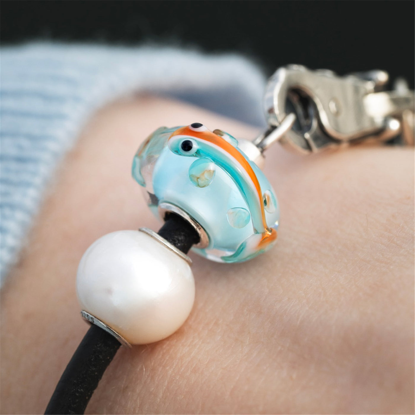 A sweet orange and turquoise fish swim in this glass bead on a core of lagoon blue.